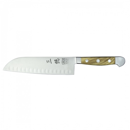 Güde Alpha Olive, nož Santoku, izredno ostro nemško jeklo, nož ima rezilo dolžine 18cm in ima pri straneh vdolbinice katere zmanjšujejo oprijem hrane na rezilo. Ročaj noža je iz lesa oljke in zato ni primerno pranje v pomivalnem stroju.