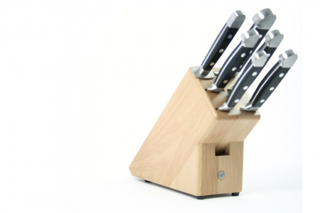 Güde komplet 5 nožev in brusne palice serije Alpha, noži so izredno kvalitetni kovani nemški noži, kaljeni na 57Hrc, brusna palica na 65Hrc. V kompletu so vsi najbolj pomembni noži, ki jih potrebuje vsaka kuhinja. Paket vsebuje: kuharjev nož 21cm, nož za kruh 21cm, univerzalni nož za razrez 16cm, nož za zelenjavo 10cm, lupilni nož 6cm, brusna palica 26cm. Stojalo za nože bukev.