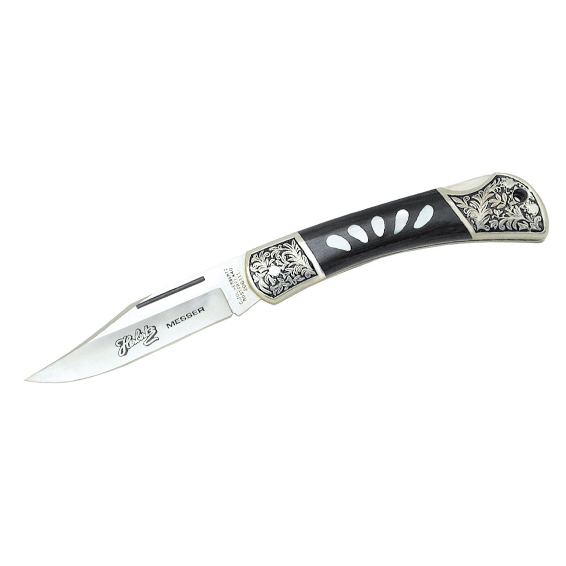 Lovski nož Herbertz. Izredno lep zložljiv žepni nož. Ročaj je narejen iz ebony lesa in ima za dekoracijo vgrajen 5 motherpearl. Ročaj je tudi pograviran. Celotna dolžina noža 19,5cm.